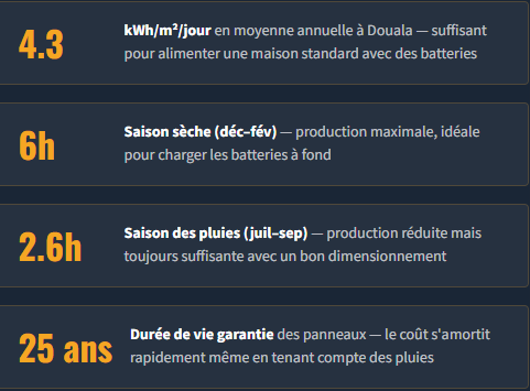En saison sèche (décembre à février), Douala reçoit jusqu’à 6 heures de soleil direct par jour. En saison des pluies, la moyenne descend à 2,6 à 4 heures, mais les panneaux continuent de produire même par ciel couvert, simplement à capacité réduite.